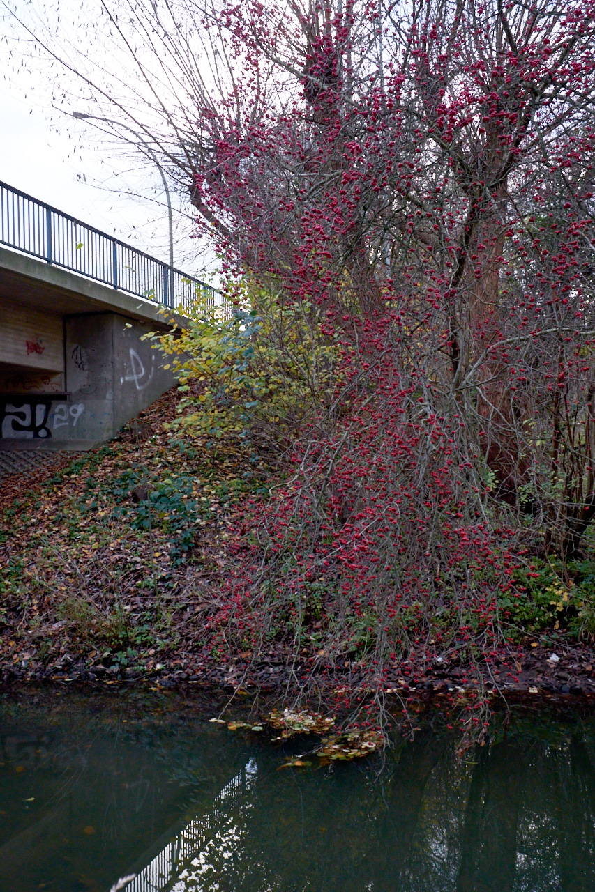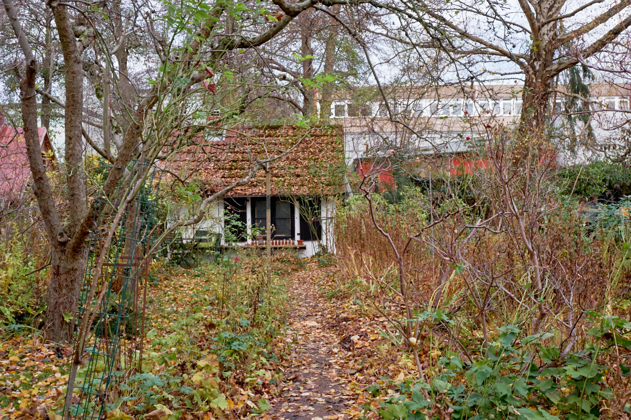 Trübe und dunkel ist es hier auch. Sonnenstunden habe ich keine gezählt, werde aber in den nächsten Wochen Gelegenheit dazu haben. Der erneute 'lockdown' wird mir hoffentlich die Möglichkeit geben unterwegs zu sein und zu fotografieren. Die Stille und Leere des Frühjahrs ist noch nicht zu spüren. Meine Bilder von heute sind von vorletzter Woche und zeigen das neu entdeckte Gebiet, in das Anne mit mir gewandert ist. Dieses Jahr habe ich eine große Liebe zu Schrebergärten entwickelt und dieses Hier ist besonders eigen, da es nur ein schmaler Streifen ist und die Häuschen wie kleine echte Häuser aussehen und nicht wie Lauben.