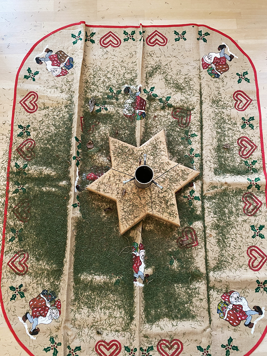 Über dieses Jahr zu sinnieren ist eine viel zu große Aufgabe für mein müdes Gehirn. Stattdessen ein paar Worte zu meinem ersten eigenen Weihnachtsbaum. Ich habe jeden morgen Weihnachtsmusik angemacht, bin mit Elena im Arm um den Baum getanzt und habe mitgesungen. Elena hat es besonders gefallen wenn ich kräftig gesungen habe und ihr war es zum Glück egal ob ich die Texte kannte. Bei einem Lied mit Panflöte hatte sie immer ein großes Lächeln im Gesicht. Auf dem Bild sieht man die Überreste – irgendwie traurig die vielen Nadeln auf dem lustigen Weihnachtsbaumteppich.