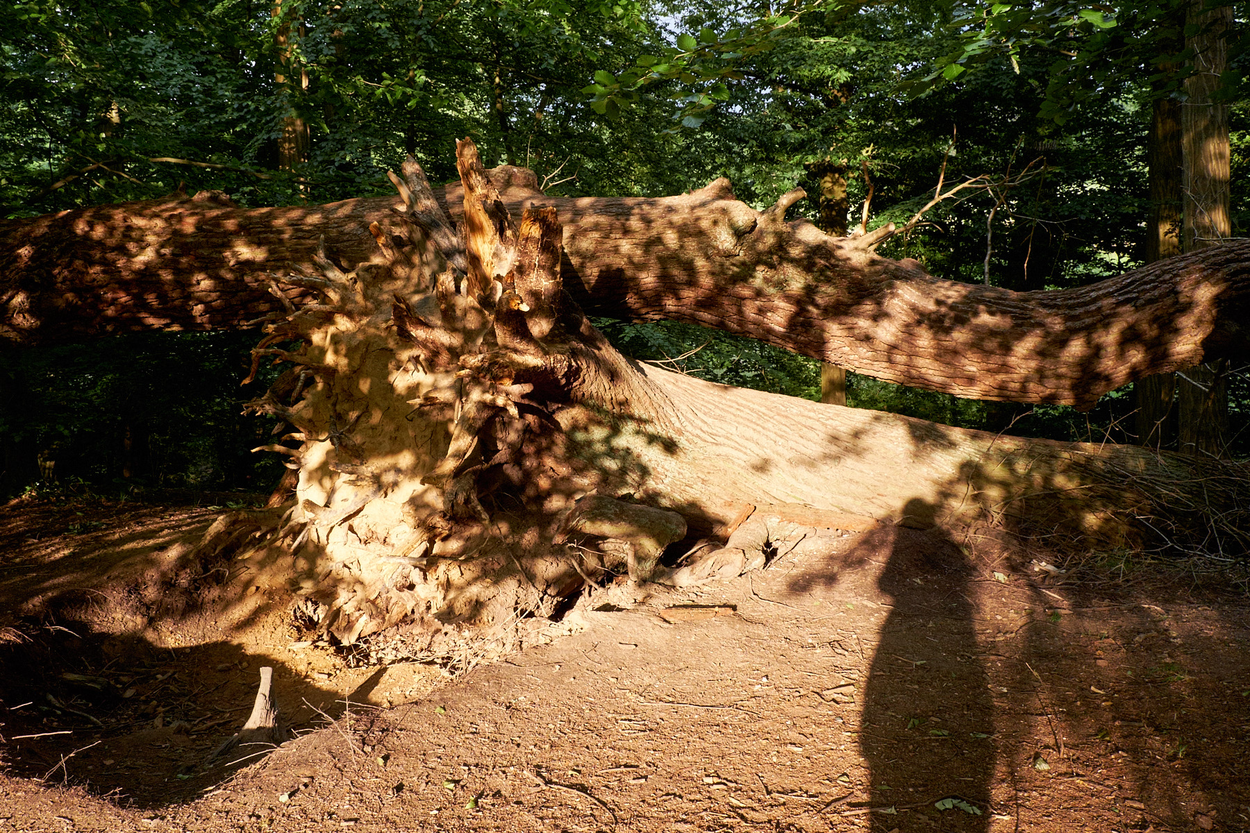 Das Thema von Licht und Schatten auf einem baumstamm habe ich vor einem Jahr in Athen auch fotografiert. Im Gegensatz dazu ist dieser Baum entwurzelt und ich bin hier auch im Bild.