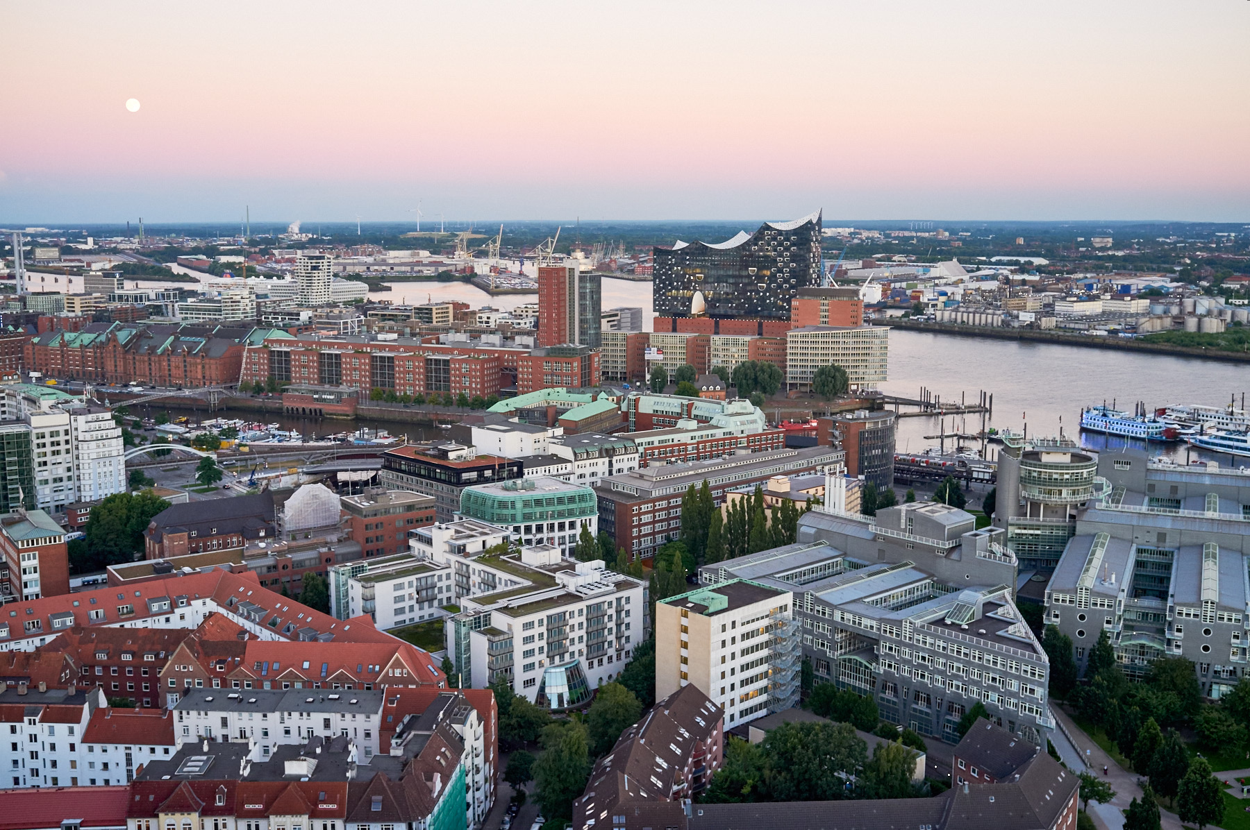 Heute ist nun Dein Umzug nach Dänemark. Es ist ein wunderbarer Sommertag, ideal um an einem Ort anzukommen und etwas Neues zu beginnen. Ich habe mich für ein älteres Bild entschieden, den Blick vom Michel in der sommerlichen Abenddämmerung. Es erinnert an den Blick aus dem Flugzeug beim Start oder Landung. Es zeigt auch gleichzeitig warum Du gehst und ich bleibe - die große Stadt.