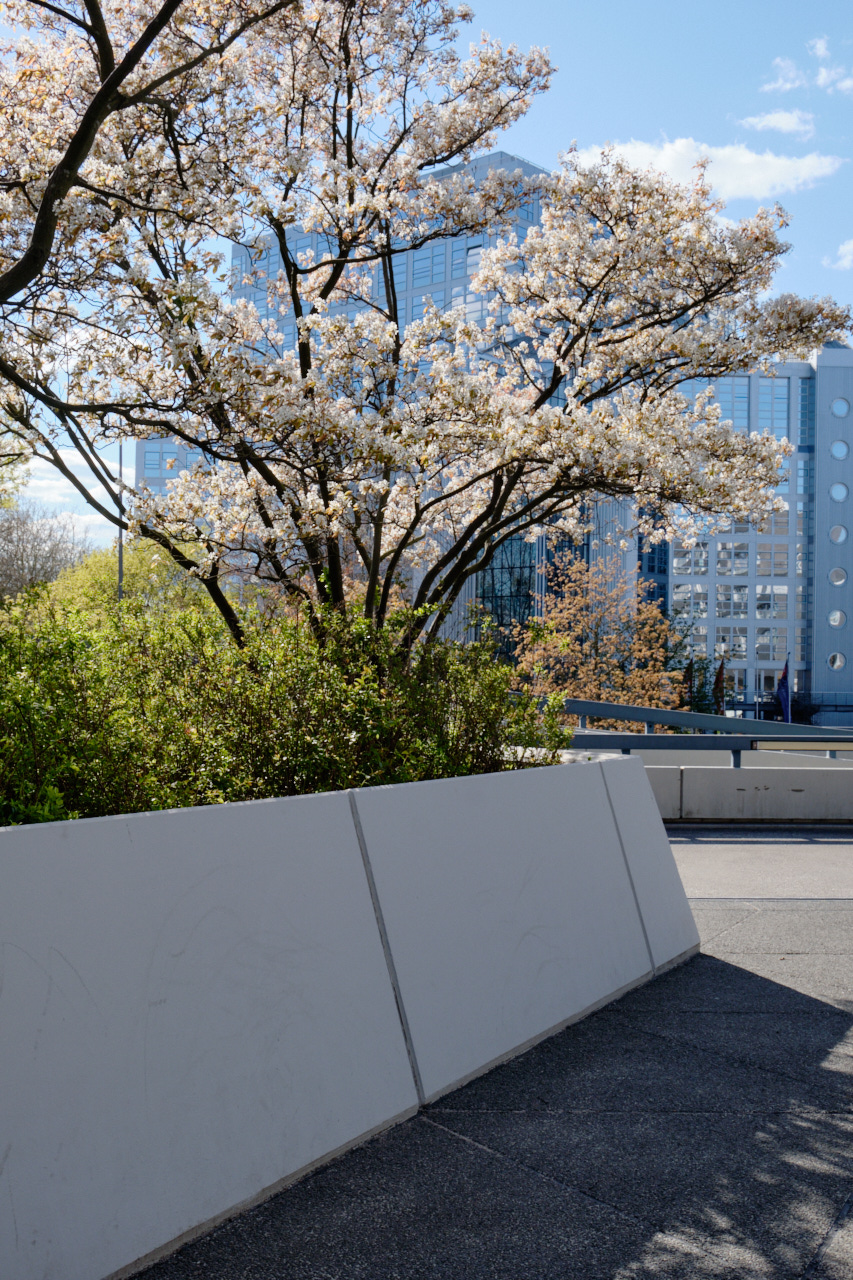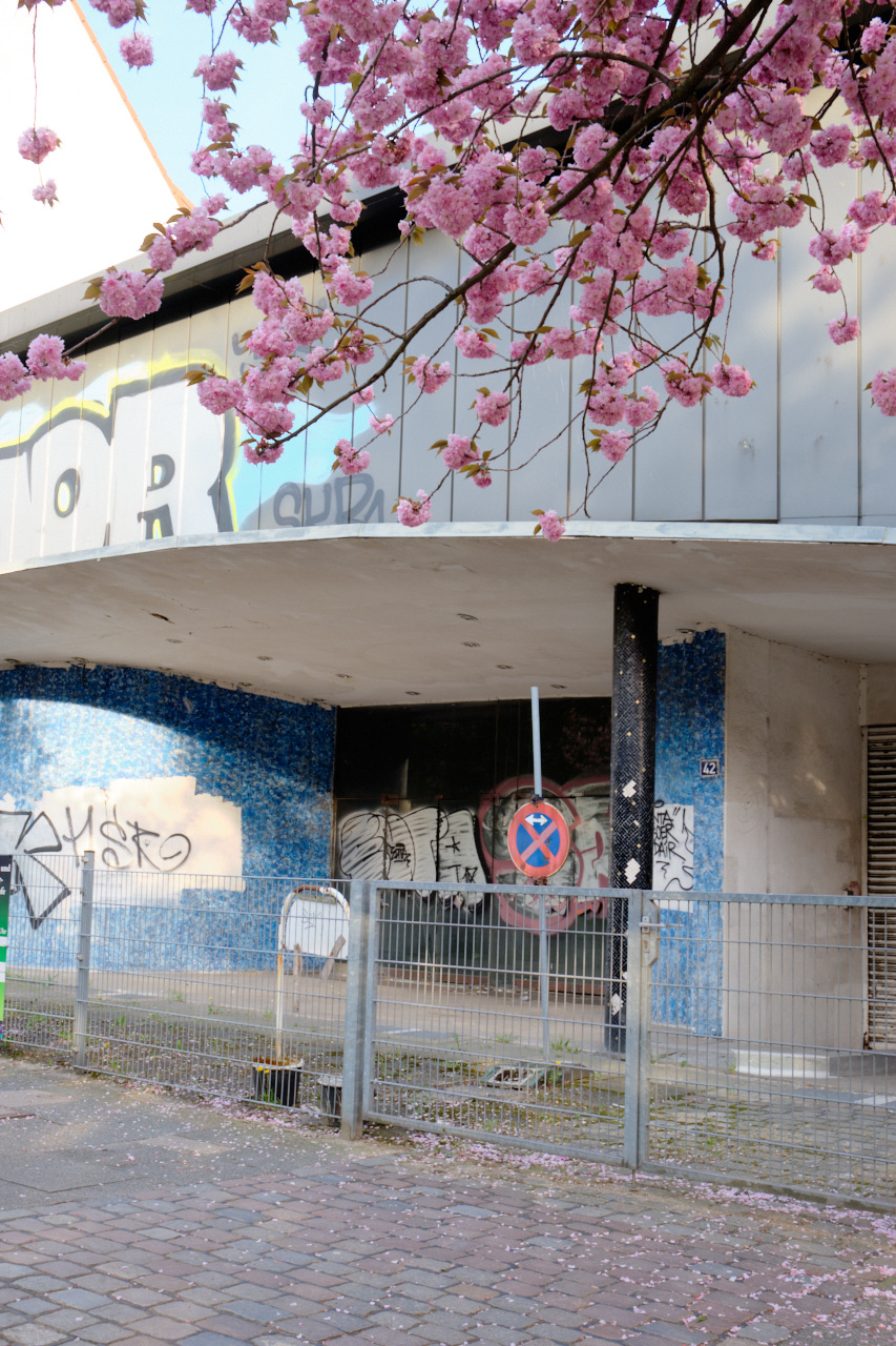 Ich habe hier tapfer meine Runden durch Viertel gedreht. An manchen Tagen habe ich das Glück von Fabian bei Dokuwa mit einem guten Getränk versorgt zu werden, an anderen halte ich mich selbst bei Laune. Letztes Wochenende war viel Familie und Besuch bei Freunden und das Fotografieren musste ich fast komplett der Küchenarbeit opfern. War aber auch schön... Das Palladiun lag auf dem Weg und ich wollte dort schon lange fotografieren, die blühenden Kirschbäume haben den Druck erhöht und so wurde dort Sonntagabend ein Zwischenstop eingelegt. Bei der Durchsicht der Bilder aus der letzten Woche sehe ich, dass ich wieder Orte der Verlassenheit und des Umbruchs fotografiert habe. Ich frage mich, wie die Zeit nach Corona aussehen wird, wird es viel Leerstand geben? Baustellen gibt es derzeit viele und es wird entgegen vieler Kritik weiter abgerissen und neu gebaut. Das Neue ist fast immer uninteressant, uninspiriert. ich würde mich gerne mal wieder über etwas Neuentstehendes freuen können.