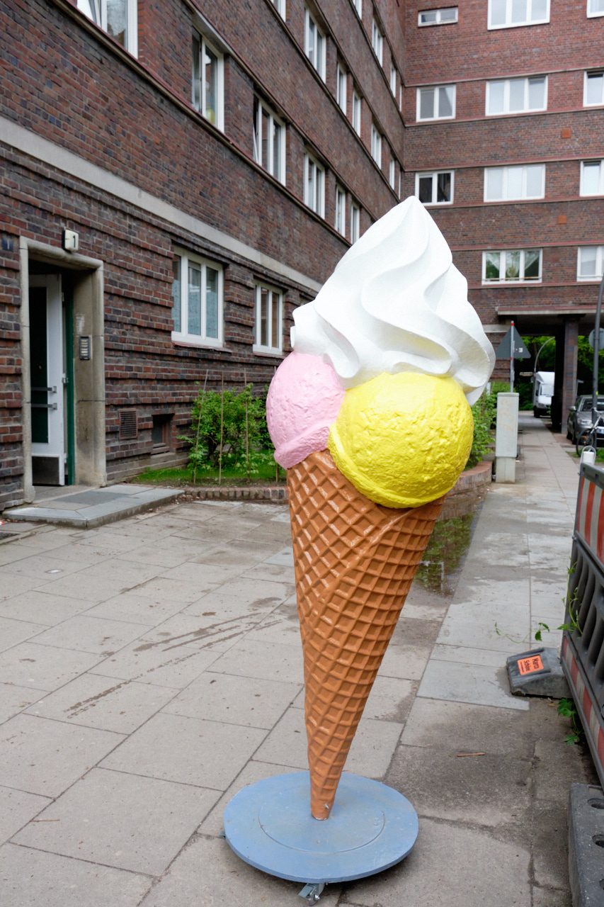 Am letzten Sonntag haben wir den Stadtteil Dulsberg erkundet. Zum Einen gibt es dort eine neue, dolle Eisdiele zum Anderen wollte ich mal eine neue Umgebung erkunde. Neu ist es natürlich gar nicht, ich dachte sogar, dass ich Teile kennen würde aber das traf nurch auf die Haupstrassen zu. Durch die vielen Backsteingebäude von Schumacher ist es auf eine Art typisch Hamburg aber die Proportionen und die Anlage der Wohnblöcke ist schon sehr speziell. Eine verlassene Kirche, ein marodes Parkhaus waren wirklich lost places. Dann gibt es aber kleine Parks und Gärten und belebtere Plätze, Baustellen und die neue Eisdiele. Es ist spannend zu sehen wie die alten Häuser z.T. saniert worden sind und zum Teil eben nicht. Ich erinnerte mich an das Musical 'Andi' von Peter Zadek, was von einem Jungen aus Dulsberg handelte. Das war 1987, ich war auch zu der Zeit am Schauspielhaus und ich fand es sehr aufregend. Die Musik war z.T von den Einstürzenden Neubauten und das Bühnenbild von Johannes Grützke. Uwe Bohm hat den Andi gespielt. So war der Ausflug auch ein bisschen eine Zeitreise.