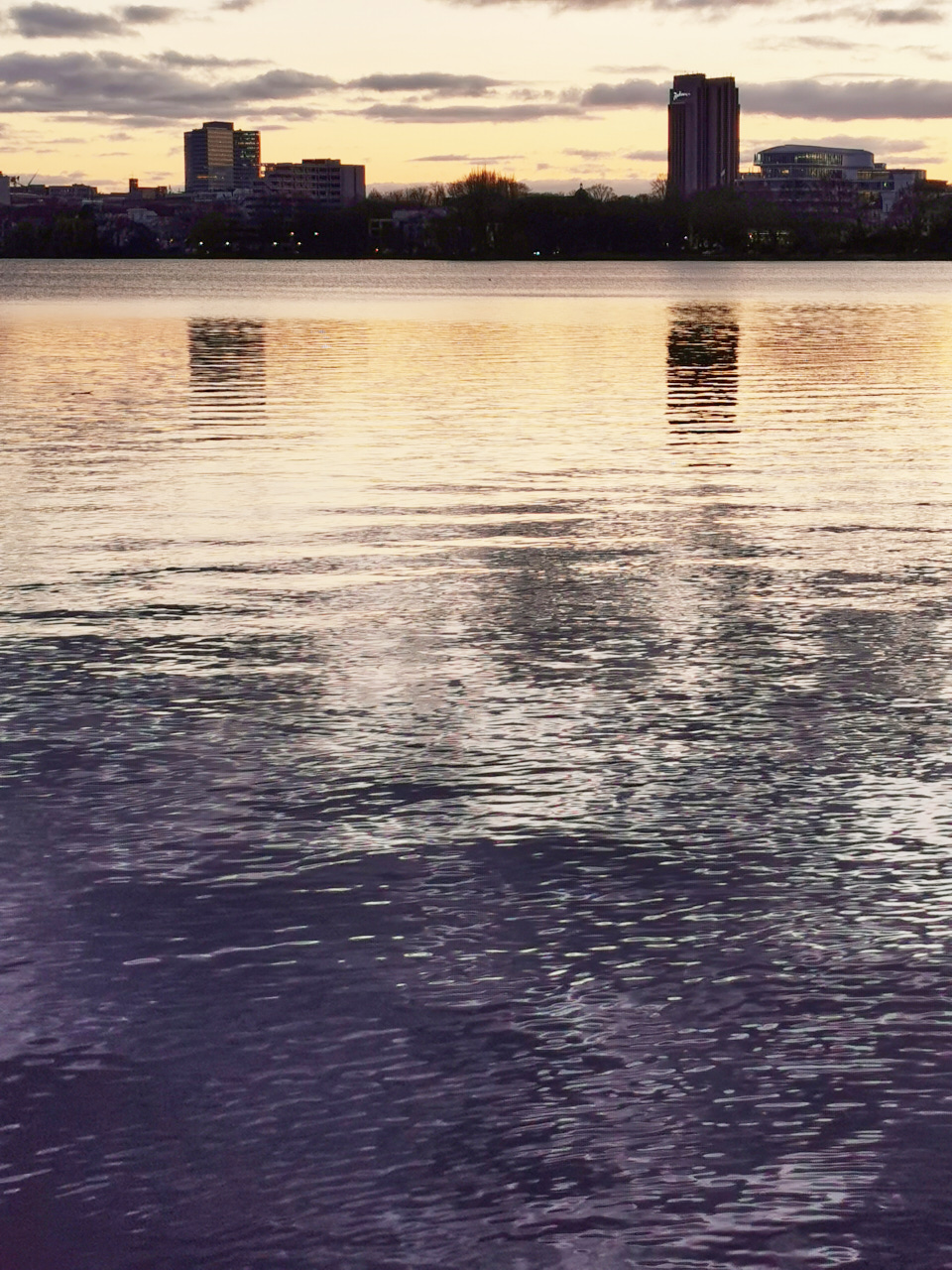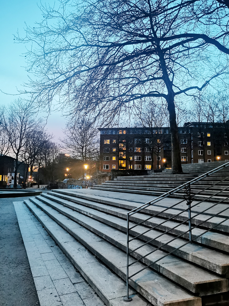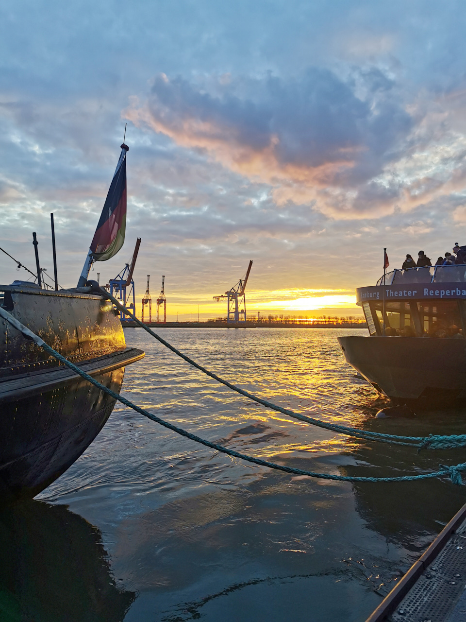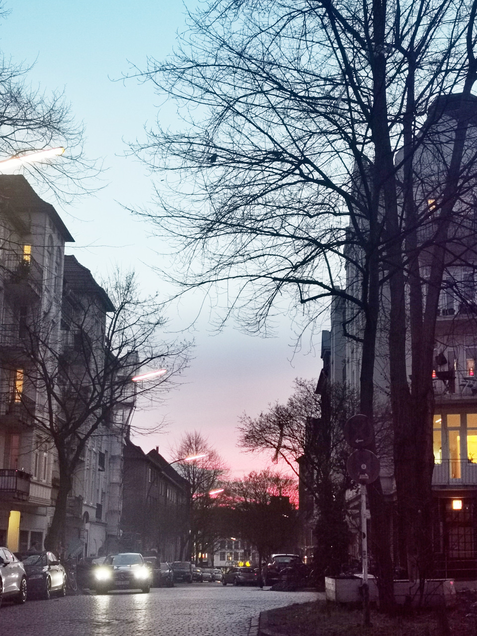 Jetzt ist es hier gerade richtig schön! Wir hatten sehr schöne Sonnenuntergänge, die Aufgänge bekomme ich leider nicht mit und vereinzelte, zauberhafte Schneeflocken. Eine Ausstellung von Kai und Dominique, in einem Raum über den Dächern der Stadt, beschehrte wunderschöne Ausblicke. ich finde die Gegend beim Nobistor sowieso sehr interessant. Danach sind wir noch auf einem langen Spaziergang in Eppendorf gewesen. das tut mir oft sehr gut, vielleicht weil ich dort aufgewachsen bin. wir sind etwas abseitig durch die Strassen und Parks gewandert. Wir sind an dem alten Frisörsalon meiner mutter vorbei gekommen. ich habe mir dort auch ein paar Male die Haare schneiden lassen. Der Frisör wohnt dort in den hinteren Räumen und alles sieht aus wie früher. Den alte Herrn sahen wir dann ein Stück weiter, die Strasse überqueren, sehr gealtert, mit Rollator. Ansonsten gibt es noch ein Bild von der Elbe, vom Samstag. Wir hatten dort Brezel und Kakao zum Sonnenuntergang und es wurde karibische Musik gespielt. Gestern war dann das großartige Konzert von Jochen Distelmeyer, im Knust. Davon gibt es leider kein Bild. ich stand ganz hinten an der Bar.